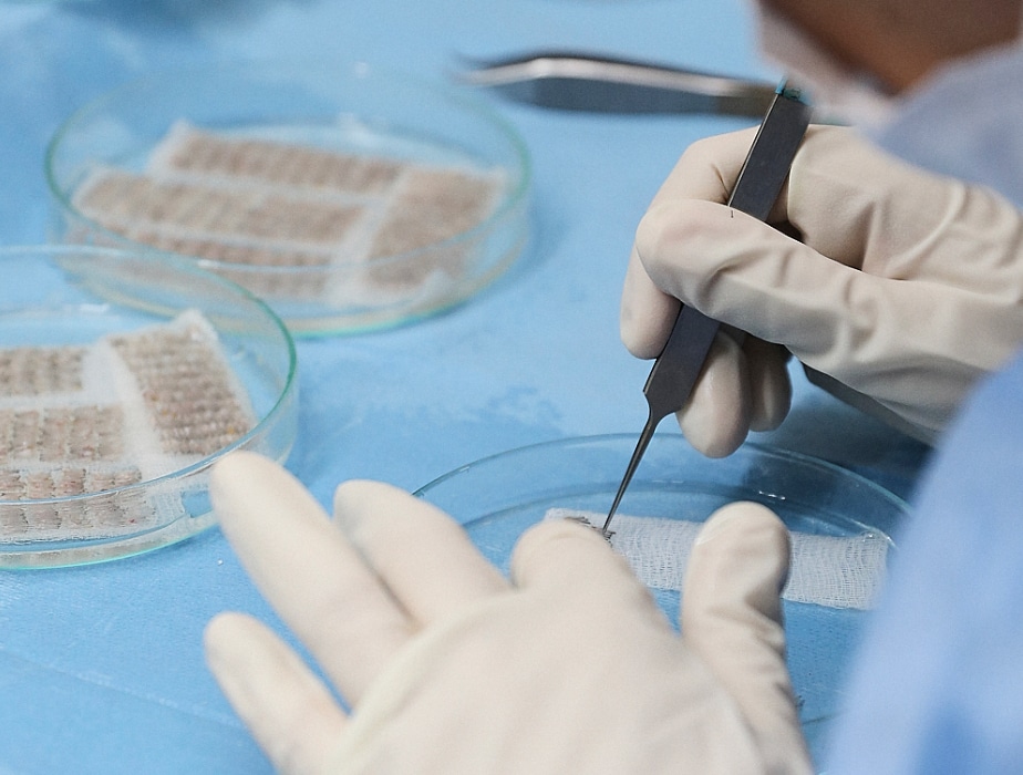 Les canaux d’implantation des greffons sont réalisées au sein de la zone receveuse. La réimplantation des greffons s’effectue manuellement à travers ces canaux.