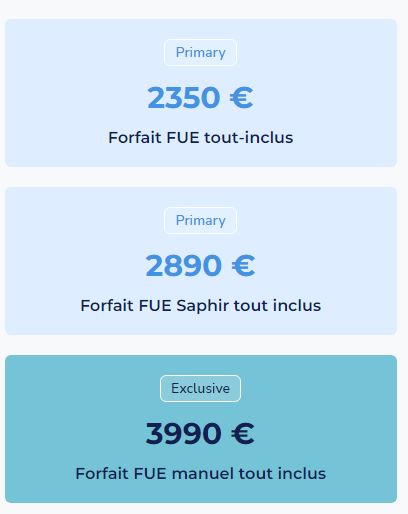 Pour les patientes souhaitant bénéficier d’une technique encore plus avancée, le forfait FUE Saphir tout inclus est disponible à partir de 2890 €. Cette variante de la FUE utilise des instruments en saphir pour une précision accrue et des suites opératoires encore plus légères.